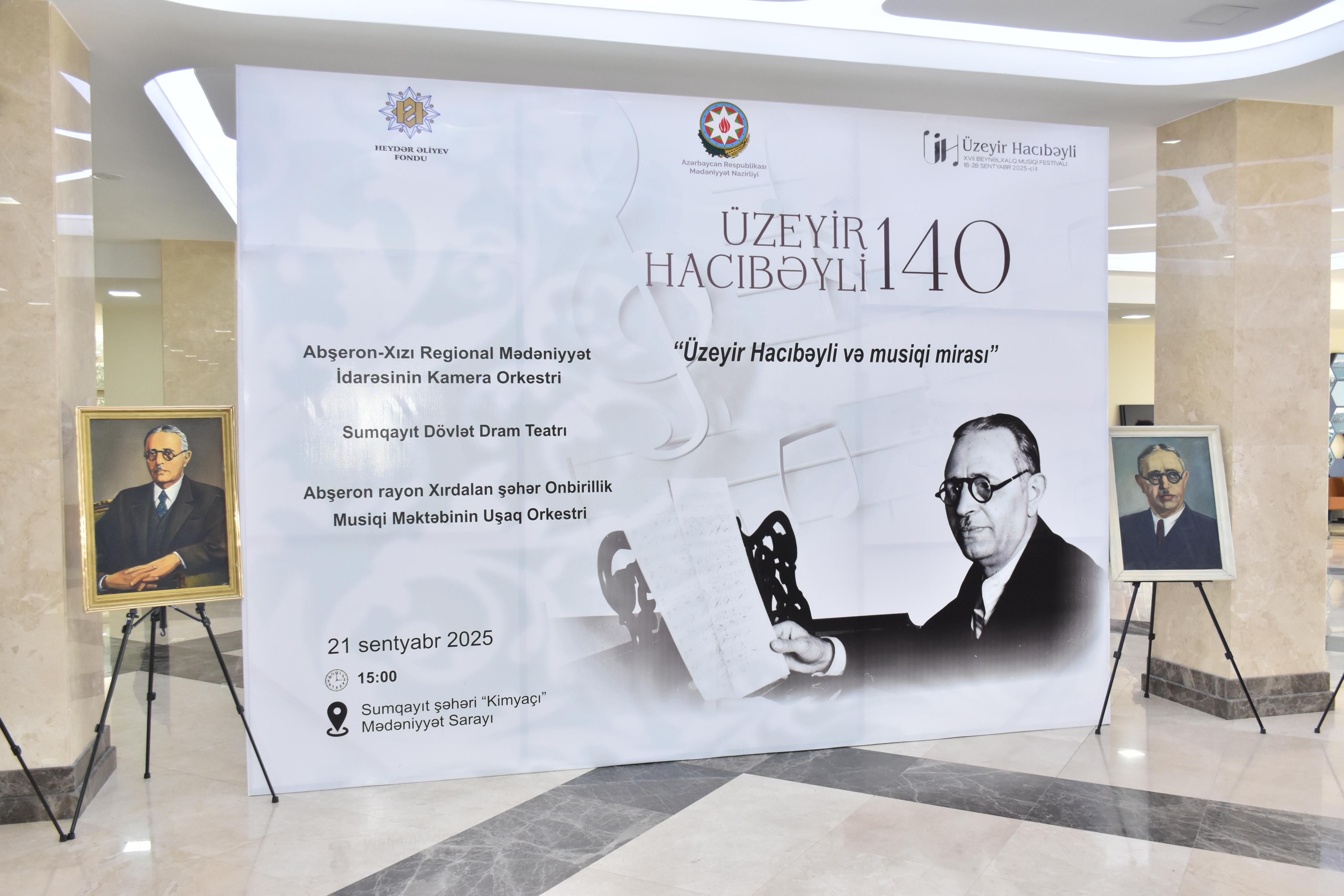Abşeron-Xızı Regional Mədəniyyət İdarəsinin təşkilatçılığı ilə Üzeyir Hacıbəylinin 140 illiyinə həsr olunmuş “Üzeyir Hacıbəyli və musiqi mirası” adlı konsert Sumqayıtda baş tutub.