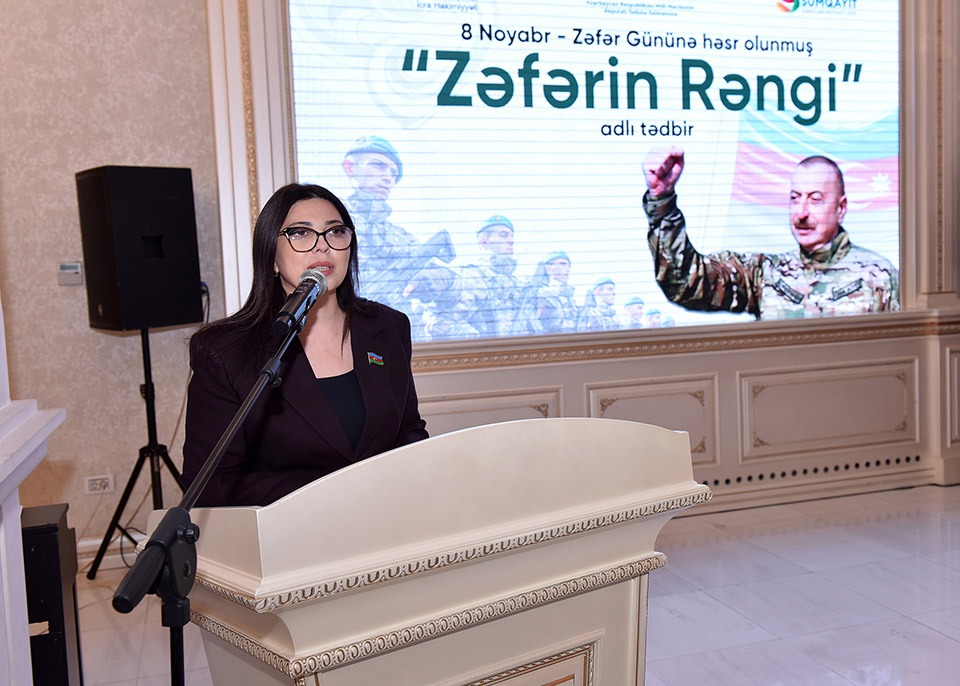 Sumqayıt şəhərində 8 Noyabr – Zəfər Günü ilə əlaqədar təşkil olunan “Zəfərin rəngi” adlı tədbirdə “44 Zəfər Plakatı” rəsm sərgisi açılıb. Tədbir Milli Məclisin deputatı Səbinə Salmanovanın təşkilatçılığı ilə Sumqayıt şəhər Heydər Əliyev Mərkəzində baş tutub.
