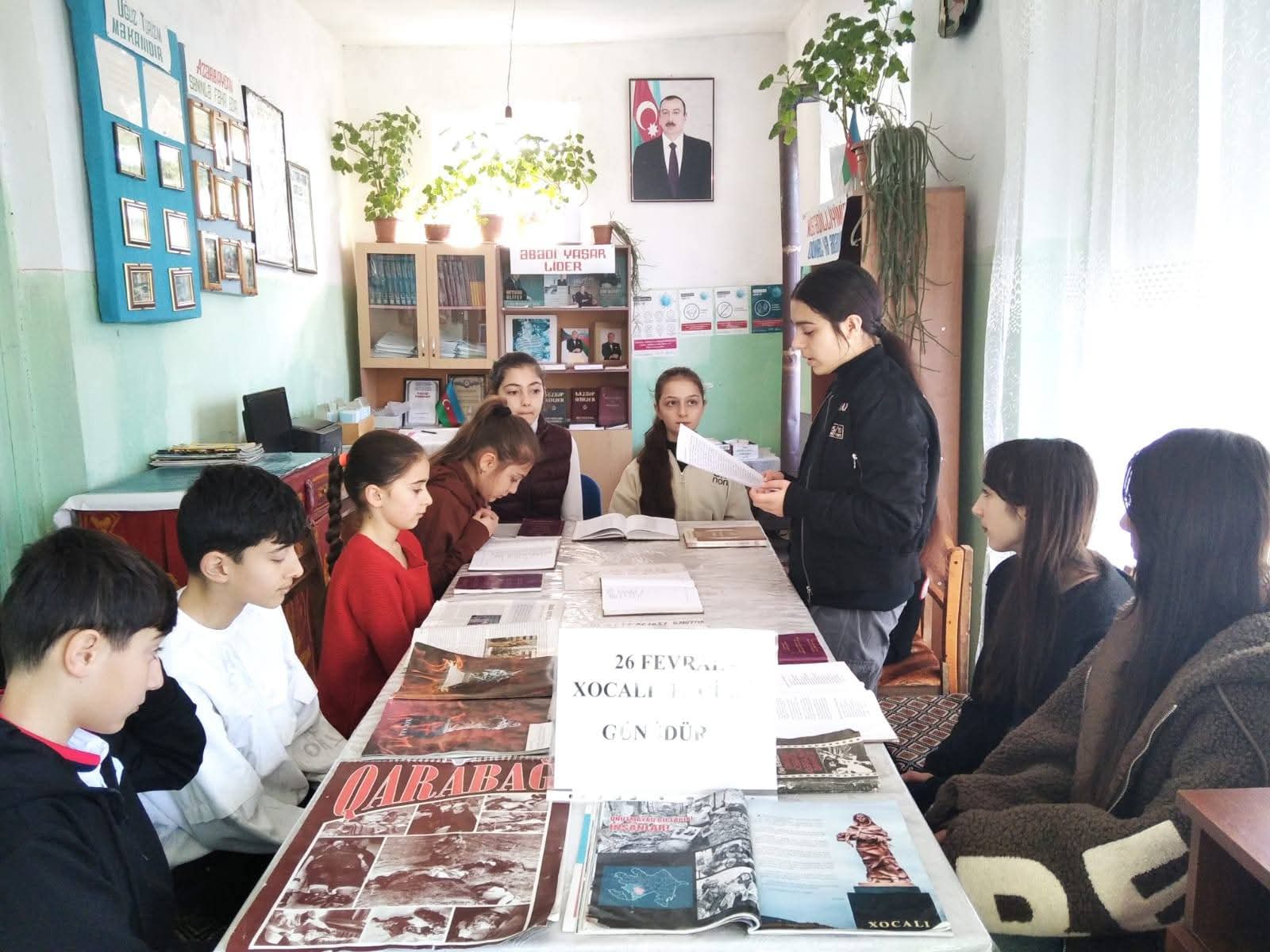 Kitabxanaçı çıxış edərək “26 Fevral – Xocalı faciəsi günüdür” mövzusunda məruzə ilə çıxış edib. Qeyd olunub ki, faciədə 613 nəfər qətlə yetirilib, 1275 nəfər əsir götürülüb, 150 nəfər itkin düşüb, 8 ailə tamamilə məhv edilib, yüzlərlə uşaq valideynlərini itirib.