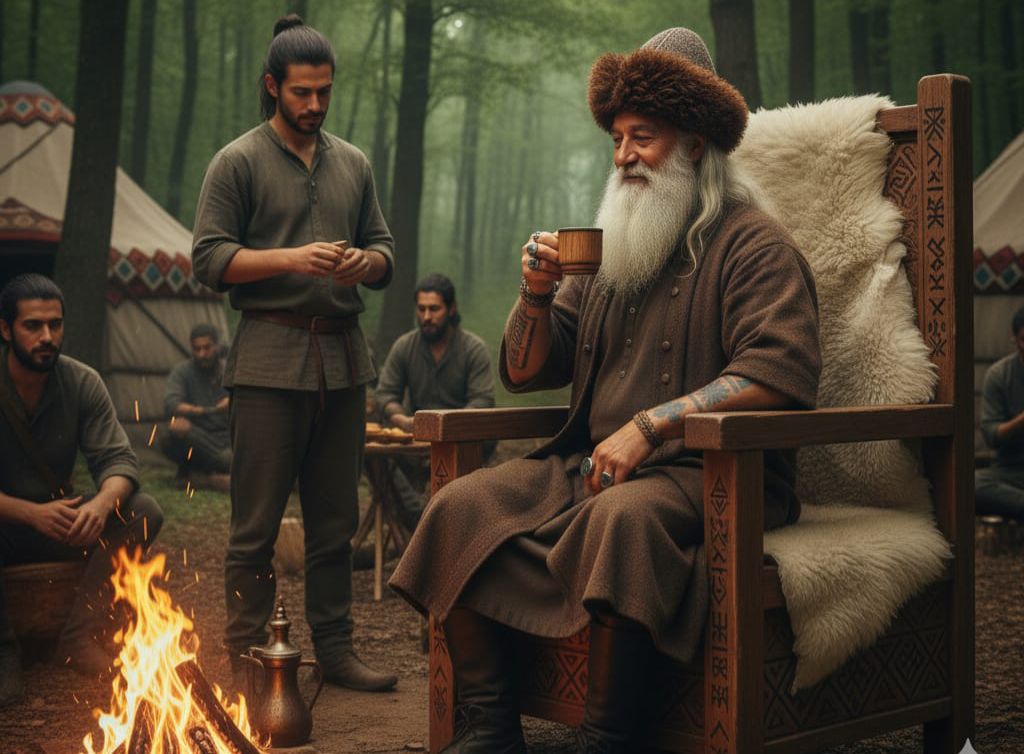 Çölçü Bilgənin başında quzu dərisindən qəhvəyi rəngdə bir börk, əynində börkün rənginə uyğun əski türk biçimində bir qaftan, baş barmağında oxçu üzüyü, qollarında dəri və iplərdən hörülmüş biləkliklər, üzündə və qollarında qəribə döymələr vardı. O qəhvə qabını ocağa qoyub, göytürk tamğaları ilə bəzədilmiş üzərinə bəyaz qoyun dərisi atılmış taxtdan olan qoltuqlu oturacağına əyləşdi.