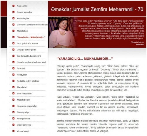 Əməkdar jurnalist, pedaqogika üzrə fəlsəfə doktoru Zemfira Məhərrəmlinin 70 illik yubileyi münasibətilə hazırlanan elektron məlumat bazası kitabxananın rəsmi saytında yerləşdirilib.