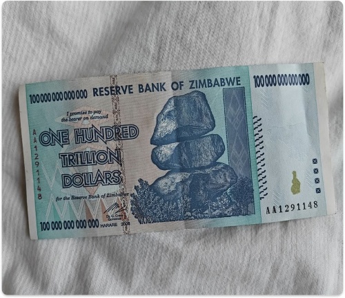 Fotoda gördüyünüz 100 trilyon yerli dollar dəyərində Zimbabve əskinasıdır. On dörd sıfırı olan bu əskinas 21-ci əsrin tarixindəki ən güclü inflyasiyanın simvoludur.