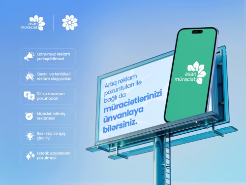 Yeni inteqrasiya nəticəsində artıq “ASAN müraciət” informasiya sistemi vasitəsilə açıq məkanlarda yerləşdirilən reklamlarla bağlı da müraciətlər ünvanla biləcək. İstifadəçilər aşağıdakı istiqamətlər üzrə müraciətlərini rahatlıqla təqdim edə bilərlər: