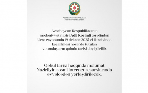 Mədəniyyət naziri Adil Kərimli tərəfindən Ucar rayonunda dekabrın 19-da keçirilməsi nəzərdə tutulan vətəndaşların qəbulu tarixi dəyişdirilib.