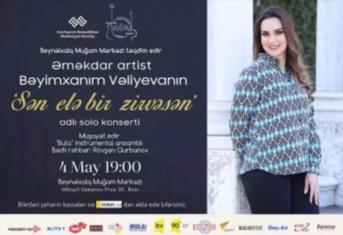 Mayın 4-də Beynəlxalq Muğam Mərkəzinin və Azərbaycan Dövlət Televiziyasının solisti, Azərbaycan Milli Konservatoriyasının baş müəllimi, Əməkdar artist, sənətşünaslıq üzrə fəlsəfə doktoru Bəyimxanım Vəliyevanın “Sən elə bir zirvəsən” adlı solo konserti keçiriləcək.